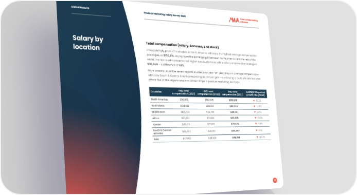 Global Results Product Marketing Salary Survey 2023 Salary by Total compensation (salary, bonuses, and stock) location Unsurprisingly, product marketers in North America still enjoy the highest average compensation packages, at $156,216. Laying bare the earnings gulf between North America and the rest of the world, the next best-compensated region was Australasia, with a total compensation average of $90,559 – a difference of 53%. More broadly, six of the seven regions studied saw year-on-year drops in average compensation – with only South & Central America recording an annual gain – continuing a trend we saw last year where five of the regions saw annualized drops in product marketing earnings. Countries Avg. total Avg. total Avg. total Average annualized compensation (2021) compensation (2022) compensation (2023) growth rate (AAGR) North America $160,618 $162,335 $156,216 -1.38% Australasia $124,862 $109,132 $90,559 -14.8% Middle East $105,793 $96,448 $89,114 -8.2% Africa $57,600 $74,514 $35,525 -21.5% Europe $89,179 $79,819 $79,675 -5.5% South & Central $58,690 $46,156 $48,507 -9% America Asia $57,600 $49,909 $36,155 -20.7% 12