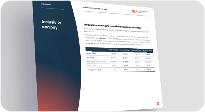 Global Results Product Marketing Salary Survey 2023 Inclusivity Product marketers who consider themselves minorities and pay When we asked folks whether they consider themselves a minority in any way, 32.1% said yes and 67.9% said no. Those who identified as a minority reported higher earnings across the board. Their average total compensation was $133,058, a massive $18,418 higher than those who do not consider themselves to be a minority. It was a similar story when it came to median salary. Minority respondents reported median earnings 12.3% higher than the overall global product marketing median salary. Yes (29.9%) 2022 Yes (32.1%) 2023 No (70.1%) 2022 No (67.9%) 2023 Median salary $120,000 $118,000 $111,000 $97,916 Avg. salary $126,443 $118,984 $116,571 $105,836 Total (salary, bonuses, stock) $144,946 $133,058 $136,310 $114,640 Yearly bonus $11,629 $9,923 $10,061 $7,941 Yearly granted stock $11,913 $10,955 $8,385 $4,846 39