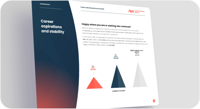 Global Results Product Marketing Salary Survey 2023 Career Happy where you are or seeking new ventures? aspirations Since a number of respondents noted that they aren't entirely satisfied with their current compensation, and noted certain benefits that’d improve their contentment, we thought it’d be and stability helpful to learn whether or not they’re on the job hunt. A little under a fifth of respondents stated that they were actively looking for a new job (up from 14% last year), with a further 43% claiming that they were open to opportunities, depending on the position. Unsurprisingly, the group with the highest median income consisted of respondents who are happy to remain in their current role ($113,000). Maybe, depends on the position 43.1% No $97,000 38.1% $113,000 Yes 18.8% $109,186 Looking for a new job? 66
