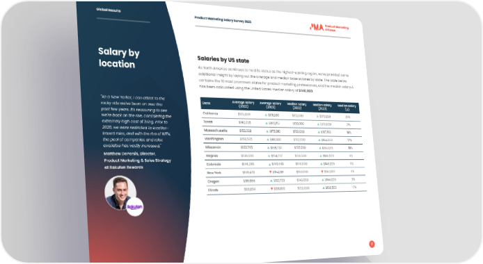 Global Results Product Marketing Salary Survey 2023 Salary by Salaries by US state location As North America continues to hold its status as the highest-earning region, we’ve provided some additional insight by laying out the average and median base salaries by state. The table below contains the 10 most prominent states for product marketing professionals, and the median salary ∆ has been calculated using the United States median salary of $140,000. "As a New Yorker, I can attest to the State Average salary Average salary Median salary Median salary Median salary rocky ride we've been on over the (2022) (2023) (2022) (2023) (∆) past few years. It's reassuring to see California $165,859 $171,506 $172,000 $175,000 25% we're back on the rise, considering the extremely high cost of living. Prior to Texas $140,206 $169,152 $130,000 $170,000 21% 2020, we were restricted to location- Massachusetts $152,029 $173,610 $150,000 $167,100 19% based roles, and with the rise of WFH, Washington $158,565 $181,200 $162,000 $164,000 17% the pool of companies and roles available has vastly increased." Wisconsin $123,785 $158,737 $135,000 $164,975 18% Matthew DePersis, Director, Virginia $138,000 $154,737 $128,500 $148,500 6% Product Marketing & Sales Strategy Colorado $144,295 $143,440 $140,000 $148,000 6% at Rakuten Rewards New York $169,478 $154,218 $150,000 $147,000 5% Oregon $116,666 $133,720 $142,000 $144,000 3% Illinois $131,834 $130,159 $130,000 $136,500 -3% 17