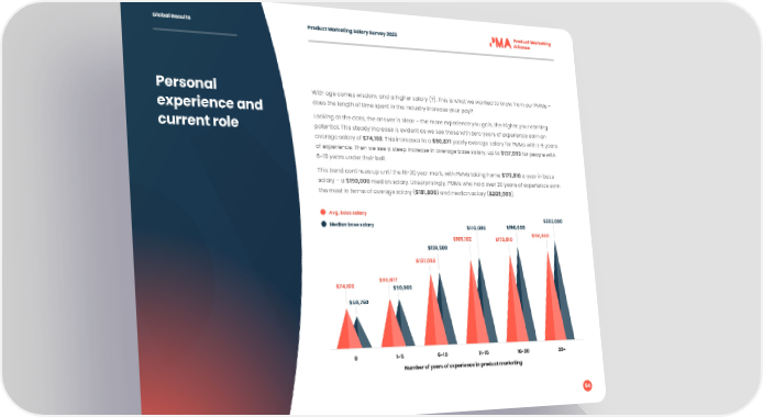 Global Results Product Marketing Salary Survey 2023 Personal With age comes wisdom, and a higher salary (?). This is what we wanted to know from our PMMs – experience and does the length of time spent in the industry increase your pay? Looking at the data, the answer is clear – the more experience you gain, the higher your earning current role potential. This steady increase is evident as we see those with zero years of experience earn an average salary of $74,103. This increases to a $90,877 yearly average salary for PMMs with 1-5 years of experience. Then we see a steep increase in average base salary, up to $137,093 for people with 6-10 years under their belt. This trend continues up until the 16-20 year mark, with PMMs taking home $173,810 a year in base salary – a $190,000 median salary. Unsurprisingly, PMMs who hold over 20 years of experience earn the most in terms of average salary ($181,800) and median salary ($203,000). Avg. base salary $203,000 Median base salary $170,000 $190,000 $165,182 $173,810 $181,800 $139,500 $137,093 $74,103 $90,877 $90,000 $58,760 0 1-5 6-10 11-15 16-20 20+ Number of years of experience in product marketing 54