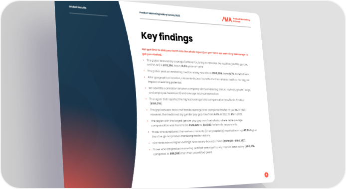 Global Results Product Marketing Salary Survey 2023 Key findings Not got time to sink your teeth into the whole report just yet? Here are some key takeaways to get you started. • The global base salary average (without factoring in variables like location, job title, gender, and so on) is $110,266, down 10.6% year-on-year. • The global product marketing median salary now sits at $105,000, down 8.7% from last year. • After geographical location, role seniority was found to the the variable that has the biggest impact on earning potential. • We saw little correlation between company size (considering annual revenue, growth, stage, and employee headcount) and average total compensation. • The region that reported the highest average total compensation was North America ($156,216). • The gap between male and female average total compensation fell to just 1% in 2023. However, the median salary gender pay gap rose from 6.9% in 2022 to 8% in 2023. • The region with the largest gender pay gap was Australasia, where male average compensation was found to be $129,825 vs. $81,833 for female respondents. • Those who considered themselves a minority (in any capacity) reported earnings 12.3% higher than the global product marketing median salary. • B2B PMMs earn a higher average base salary than B2C PMMs ($120,021 > $100,882). • Those who are product marketing certified earn significantly more in base salary ($115,000 compared to $98,268) than their uncertified peers. 4