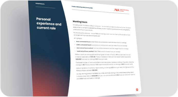 Global Results Product Marketing Salary Survey 2023 Personal Working hours experience and A healthy work-life balance is key in every role – no one wants to experience burnout, on an individual level or from a company’s perspective. It’s easy to work more than you’re contractually obligated to, current role particularly if you’re passionate. So what does the data say – do our PMMs, on average, work more than their contracts dictate? And do longer working hours lead to higher pay? At a glimpse: • Most contracted hours: Israeli PMMs are contracted to work the most hours on average. • Least contracted hours: Australians are contracted to work the fewest hours on average. • Most actual hours worked: German product marketers work the longest hours on average. • Least actual hours worked: Polish PMMs work the fewest hours on average. PMMs in Israel are contracted to work the highest number of hours at 44 hours per week and earn a median base salary of $95,768. Product marketers in India earn the lowest median base salary ($30,000) and work on average 44.4 hours per week. The lowest number of hours contracted to work are product marketers working in Australia, where the average is 38.7 hours, however, PMMs report to actually work for an average of 42.9 hours per week. Product marketers in Germany report working, on average, 47.3 hours per week, the highest out of our PMMs surveyed, and earn $80,000. Our top-earning product marketers, by a mile, are those working in the United States, as they rake in a median base salary of $140,000 per year, are contracted to work 39.4 hours per week, and report to work 43.6 hours per week on average. 59