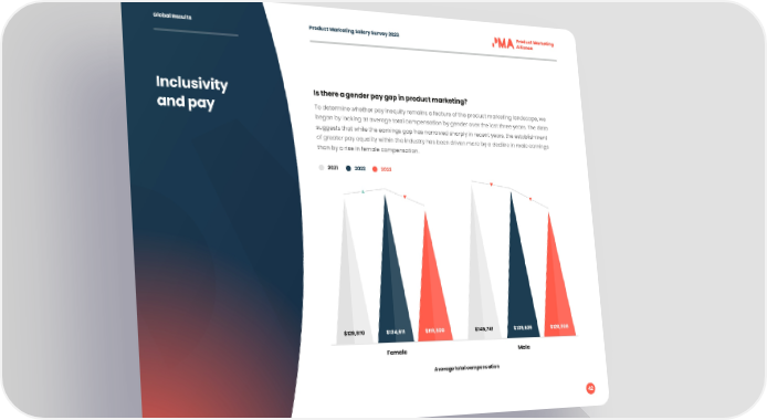Global Results Product Marketing Salary Survey 2023 Inclusivity Is there a gender pay gap in product marketing? and pay To determine whether pay inequity remains a feature of the product marketing landscape, we began by looking at average total compensation by gender over the last three years. The data suggests that while the earnings gap has narrowed sharply in recent years, the establishment of greater pay equality within the industry has been driven more by a decline in male earnings than by a rise in female compensation. 2021 2022 2023 $129,970 $134,611 $119,800 $145,741 $139,636 $120,908 Female Male Average total compensation 42