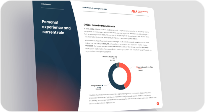 Global Results Product Marketing Salary Survey 2023 Personal Office-based versus remote experience and In 2022, 60.5% of PMMs reported working remotely. Despite a concerted effort by many high-profile companies to encourage a return to the office, over half of product marketers are still working in a current role fully remote capacity in 2023, with a further 43.6% splitting their time between home and the office. This means that just under 5% of product marketers are now fully office-based. What does this mean financially? PMMs working in a fully remote capacity were found to have the highest median salary at $120,000, followed by hybrid workers who reported a median income of $90,000. The lowest-earners were those who spend 100% of their time in the office ($53,996) – however, it’s worth noting that respondents from this group were also more likely to work for start-up organizations that typically pay less. Always in the office 4.4% $53,996 Remotely and in the office 43.6% $90,000 Always remote 51.9% $120,000 This data illustrates how work modalities are reshaping salary structures in the evolving work landscape. Remote and hybrid work models are not just about location flexibility; they're also influencing how companies value and compensate for different roles, reflecting broader shifts in work culture and employee expectations. 61