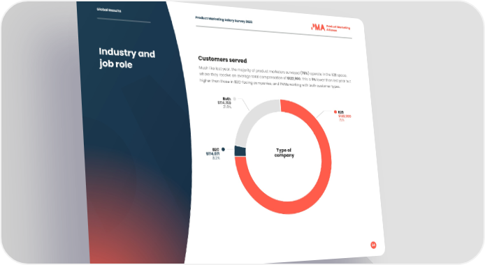 Global Results Product Marketing Salary Survey 2023 Industry and Customers served job role Much like last year, the majority of product marketers surveyed (75%) operate in the B2B space, where they receive an average total compensation of $122,900. This is 9% lower than last year but higher than those in B2C-facing companies, and PMMs working with both customer types. Both $114,159 21.8% B2B $122,900 75% B2C Type of $114,071 company 3.2% 24