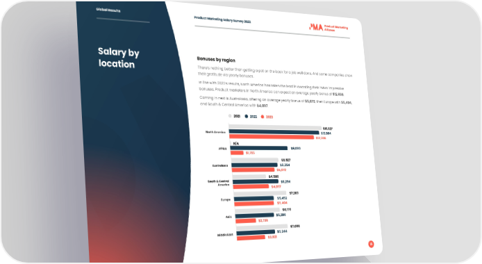 Global Results Product Marketing Salary Survey 2023 Salary by Bonuses by region location There’s nothing better than getting a pat on the back for a job well done. And some companies show their gratitude via yearly bonuses. In line with 2022’s results, North America has taken the lead in awarding their PMMs impressive bonuses. Product marketers in North America can expect an average yearly bonus of $12,036. Coming in next is Australasia, offering an average yearly bonus of $5,872, then Europe with $5,404, and South & Central America with $4,897. 2021 2022 2023 $13,327 North America $12,884 $12,036 N/A Africa $8,000 $1,725 $6,527 Australasia $6,354 $5,872 South & Central $4,580 America $6,294 $4,897 $7,283 Europe $5,452 $5,404 $6,170 Asia $5,280 $2,738 $7,096 Middle East $5,244 $3,821 15