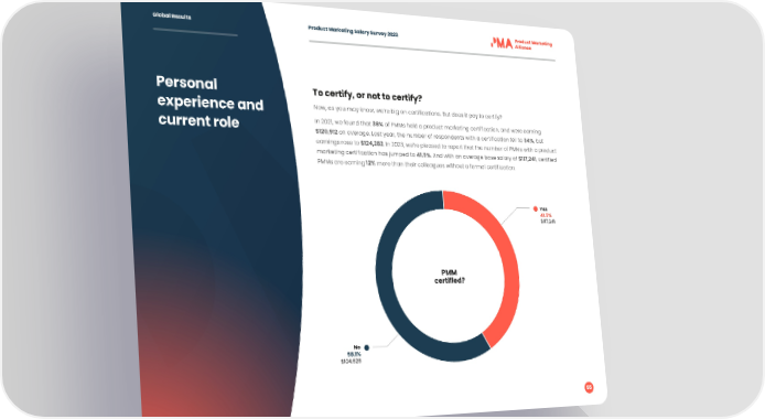 Global Results Product Marketing Salary Survey 2023 Personal To certify, or not to certify? experience and Now, as you may know, we’re big on certifications. But does it pay to certify? current role In 2021, we found that 36% of PMMs held a product marketing certification, and were earning $120,912 on average. Last year, the number of respondents with a certification fell to 34%, but earnings rose to $124,282. In 2023, we’re pleased to report that the number of PMMs with a product marketing certification has jumped to 41.9%. And with an average base salary of $117,241, certified PMMs are earning 12% more than their colleagues without a formal certification. Yes 41.9% $117,241 PMM certified? No 58.1% $104,626 55