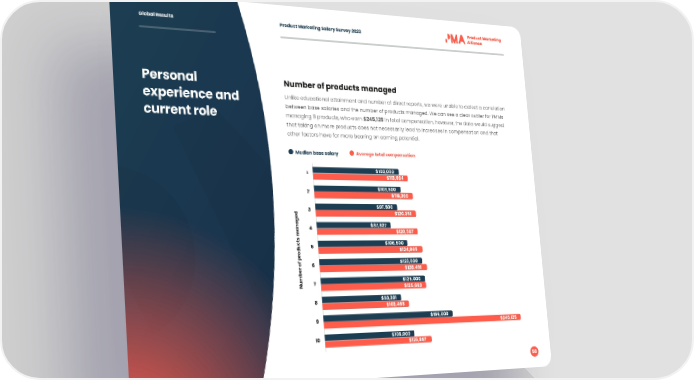 Global Results Product Marketing Salary Survey 2023 Personal Number of products managed experience and Unlike educational attainment and number of direct reports, we were unable to detect a correlation between base salaries and the number of products managed. We can see a clear outlier for PMMs current role managing 9 products, who earn $245,125 in total compensation, however, the data would suggest that taking on more products does not necessarily lead to increases in compensation and that other factors have far more bearing on earning potential. Median base salary Average total compensation 1 $103,000 $113,694 2 $103,500 $118,200 3 $97,500 $120,351 4 $87,827 $120,587 5 $106,500 $124,865 6 $123,000 $128,491 Number of products managed7 $125,000 $125,663 8 $93,391 $102,468 9 $156,000 $245,125 10 $106,000 $126,897 58