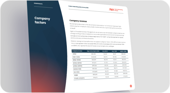 Global Results Product Marketing Salary Survey 2023 Company Company revenue factors We wanted to take a look at the role company revenue plays in all of this. Do those super high- earners pay their employees more, provide meatier bonuses, or grant more generous amounts of stock? Again, at the extreme ends of the spectrum, we can see a clear link between company revenue and average earnings. Product marketers at very small organizations receive by far the lowest average bonuses and annual salaries, whereas respondents from $2BN+ companies reported the highest salaries, bonuses, and stock allocations. However, average compensation does not appear to progress linearly in line with company revenue. This is most apparent when we isolate PMMs who work at businesses with revenues between $1BN and $2BN, who reported the second-lowest annual compensation packages. Company revenue Avg. total compensation Avg. bonus Avg. stock Median salary $2BN $165,310 $16,524 $15,734 $133,500 Private company $118,315 $5,510 $5,668 $115,000 32
