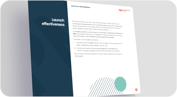 State of Go-to-Market 2023 Report Launch From these results, we can see a clear correlation between product launches and achieving the intended results of a Go-to-Market strategy. The majority of respondents effectiveness found that most product sales happen within the launch window and that launches have a notable or major impact on their company’s revenue. An interesting statistic to pull out here is that the majority of respondents said less than 50% of the products they launch are adopted. This seems at odds with the rest of the data in this section, which indicates launches are generally successful. This leads us to two possible conclusions: 1. Expecting a more than 50% adoption rate is unrealistic and a successful launch doesn’t necessitate a higher adoption rate than this. 2. The success of these launches is being mitigated by underutilisation of customer-success strategies and the post-launch stage of Go-to-Market. Both of these conclusions are likely true, but the answer depends on the company and its goals. 48