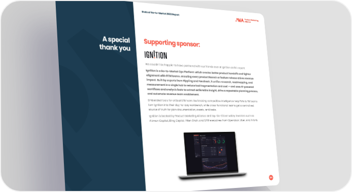 State of Go-to-Market 2023 Report A special Supporting sponsor: thank you We couldn’t be happier to have partnered with our friends over at Ignition on this report. Ignition is a Go-to-Market Ops Platform which creates better product handoffs and tighter alignment with GTM teams, ensuring every product launch or feature release drives revenue impact. Built by experts from Rippling and Facebook, it uni昀椀es research, roadmapping, and measurement in a single hub to reduce tool fragmentation and cost — and uses AI-powered work昀氀ows and analysis tools to extract actionable insight, drive a repeatable planning process, and automate revenue team enablement. Embedded tools for critical GTM work like tracking competitive intelligence help PMM & PM teams turn Ignition into their day-to-day workbench, while cross-functional teams get a centralized source of truth for plan documentation, assets, and tasks. Ignition is backed by Product Marketing Alliance and top-tier Silicon Valley investors such as Altman Capital, Bling Capital, Hiten Shah, and GTM executives from Opendoor, Uber, and Airbnb. 84