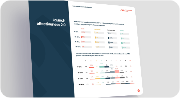 State of Go-to-Market 2023 Report Launch ‘What % of your launches are successful?’ vs ‘Philosophically, how much importance effectiveness 2.0 would you say your company places on launches?’ Rarely Sometimes Most Launches Always 0-25% 2.6% 5.1% 9% 1.3% 26-50% 3.9% 9% 11.5% 7.7% 51-75% 1.3% 3.9% 11.5% 14% 76-100% 0% 2.6% 6.4% 10.2% ‘What % of your launches are successful?’ vs ‘On a scale of 1-10, how would you rate your GTM process’ level of maturity and effectiveness?’ 1 2 3 4 5 6 7 8 9 10 2.6% 7.7% 5% 2.6% 0-25% 0% 0% 0% 0% 0% 0% 1.3% 2.6% 2.6% 9% 12.8% 3.9% 26-50% 0% 0% 0% 0% 51-75% 0% 1.3% 3.9% 3.9% 5% 5% 5% 6.4% 0% 0% 76-100% 0% 0% 1.3% 0% 1.3% 5% 3.9% 3.9% 2.6% 1.3% 51