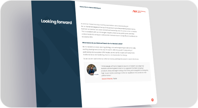 State of Go-to-Market 2023 Report Looking forward A common thread here is just setting expectations and understanding for Go-to-Market strategies at the top of the product cycle. Respondents predominantly feel their companies lack clear and de昀椀ned leadership when it comes to Go-to-Market. This is consistent with our challenges chapter, where survey participants identi昀椀ed unclear leadership and poor collaboration between teams as signi昀椀cant roadblocks for successful GTM. What trends do you think we’ll see in Go-to-Market in 2023? Go-to-Market is an ever-evolving strategy, and we’re expecting to see some really exciting developments in the next 12 months. With the growth in popularity of partnership and ecosystem GTM models, as well as the industry shift away from traditional sales-led marketing, there’s a lot of potential for change. So we couldn’t wait to 昀椀nd out what our survey participants expect to see in the future. “I think people will look at OpenAI’s launch of ChatGPT and other PLG motions and be inspired to test a PLG approach for their company/ products. Many will begin testing a free entry point alongside an enterprise, high-touch motion and begin to 昀椀nd an equilibrium that produces max performance.” Devon O’Rourke, Fluvio 76