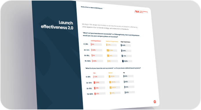 State of Go-to-Market 2023 Report Launch We dug a little deeper into the data to see how the success of a launch is affected by effectiveness 2.0 other aspects of Go-to-Market strategy. Let’s take a look at the results. ‘What % of your launches are successful?’ vs ‘Philosophically, how much importance would you say your company places on launches?’ Low importance Medium importance High importance 0-25% 4% 7.7% 6.4% 26-50% 2.6% 21.8% 6.4% 51-75% 5% 19% 7.7% 76-100% 2.6% 4% 12.8% ‘What % of your launches are successful?’ vs ‘Do you have a de昀椀ned launch process?’ Yes Sort of No 0-25% 1.3% 12.8% 3.9% 26-50% 11.5% 16.7% 3.9% 51-75% 10% 16.7% 3.9% 76-100% 7.7% 7.7% 3.9% 50