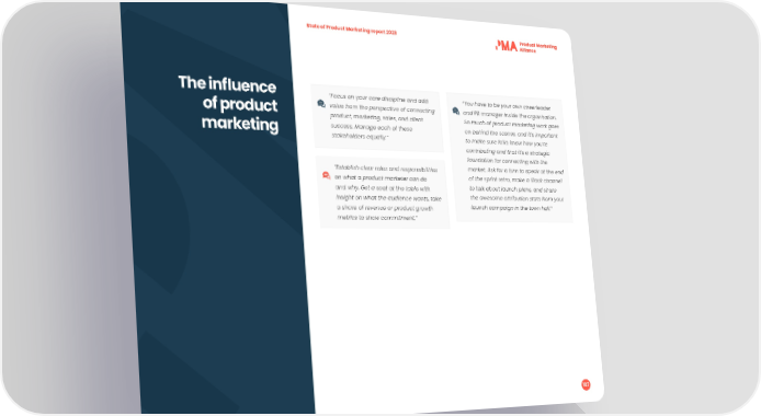 State of Product Marketing report 2023 The in昀氀uence “Focus on your core discipline and add “You have to be your own cheerleader of product value from the perspective of connecting and PR manager inside the organization. product, marketing, sales, and client So much of product marketing work goes marketing success. Manage each of these on behind the scenes, and it’s important stakeholders equally.” to make sure folks know how you’re contributing and that it’s a strategic foundation for connecting with the “Establish clear roles and responsibilities market. Ask for a turn to speak at the end on what a product marketer can do of the sprint retro, make a Slack channel and why, Get a seat at the table with to talk about launch plans, and share insight on what the audience wants, take the awesome attribution stats from your launch campaign in the town hall.” a share of revenue or product growth metrics to show commitment.” 107