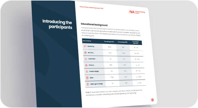 State of Product Marketing report 2023 Introducing the Educational background participants Having dissected what our participants and their companies look like, now, let’s take a look at some of the most common educational routes taken by product marketers, using the top 昀椀ve areas of study identi昀椀ed in 2022 (Marketing, Business, Economics, Finance, and Product Design) as a starting point. Area of study Percentage 2023 Percentage 2022 % increase/ decrease Marketing 36.4% 38% -1.6% Business 33.1% 34.3% -1.2% Economics 4% 14.1% -10.1% Finance 5.3% 4.3% +1% Product design 1.3% 3.1% -1.8% Other 17.9% 4.4% +13.5% I didn’t go to college 2% 1.8% +2% 17.9% of respondents fell into the ‘Other’ category, with areas of study including Medicine, Architecture, Journalism, Advertising, Mechanical Engineering, and Psychology. 27
