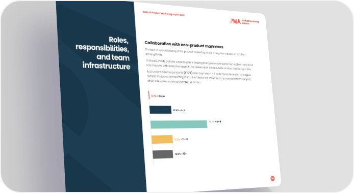 State of Product Marketing report 2023 Roles, Collaboration with non-product marketers responsibilities, The lack of understanding of the product marketing role is a long-term source of irritation among PMMs. and team That said, PMMs do have a role to play in helping their peers understand the function - and this’ll infrastructure only improve with more time spent in the presence of those outside product marketing circles. Just under half of respondents (47.7%) said they have 4 - 6 daily interactions with colleagues outside the product marketing team. This follows the same trend as our report from last year, when this option was also the most common. 0.7% - None 17.9% - 1 - 3 47.7% - 4 - 6 17.2% - 7 - 10 16.5% - 10+ 56