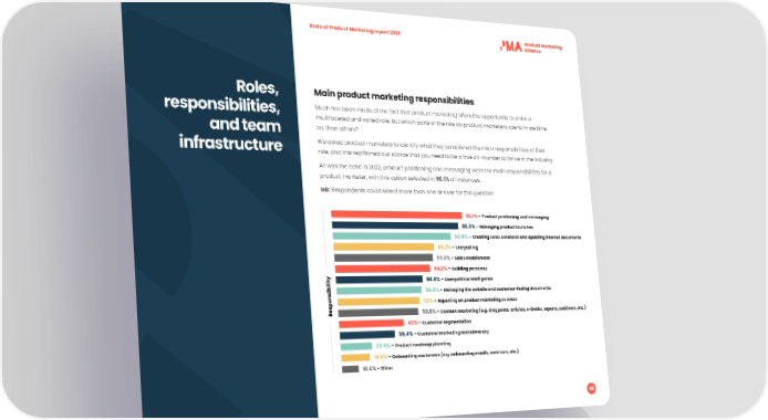 State of Product Marketing report 2023 Roles, Main product marketing responsibilities responsibilities, Much has been made of the fact that product marketing offers the opportunity to enter a multifaceted and varied role. But which parts of the role do product marketers spend more time and team on, than others? infrastructure We asked product marketers to identify what they considered the main responsibilities of their role, and this reaf昀椀rmed our stance that you need to be a true all-rounder to thrive in the industry. As was the case in 2022, product positioning and messaging were the main responsibilities for a product marketer, with this option selected in 90.1% of instances. NB: Respondents could select more than one answer for this question. 90.1% - Product positioning and messaging 86.8% - Managing product launches 80.8% - Creating sales collateral and updating internal documents 68.2% - Storytelling 66.9% - Sales enablement 64.2% - Building personas 58.9% - Competitive intelligence 58.3% - Managing the website and customer-facing documents 55% - Reporting on product marketing success Responsibility 53.6% - Content marketing (e.g. blog posts, articles, e-books, reports, webinars, etc.) 43% - Customer segmentation 36.4% - Customer marketing and advocacy 20.5% - Product roadmap planning 18.5% - Onboarding customers (e.g. onboarding emails, webinars, etc.) 10.6% - Other 48