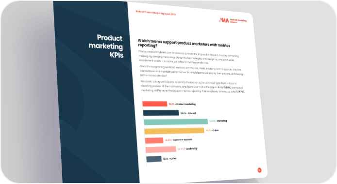 State of Product Marketing report 2023 Product Which teams support product marketers with metrics marketing reporting? Product marketers bend over backwards to make the impossible happen, creating compelling KPIs messaging, devising meticulous Go-to-Market strategies, and designing invaluable sales enablement assets - to name just a few of their responsibilities. Given the burgeoning workload involved with the role, PMMs inevitably need support to alleviate the workload and maintain performance. So, which teams are playing their part and contributing to the metrics process? We asked survey participants to identify the teams that’re contributing to the metrics and reporting process at their company, and found over half of the respondents (53.6%) earmarked marketing as the team that support metrics reporting. This was closely followed by sales (49.7%). 19.9% - Product marketing 29.1% - Product 53.6% - Marketing 49.7% - Sales 14.6% - Customer success 24.5% - Leadership 11.9% - Other 61