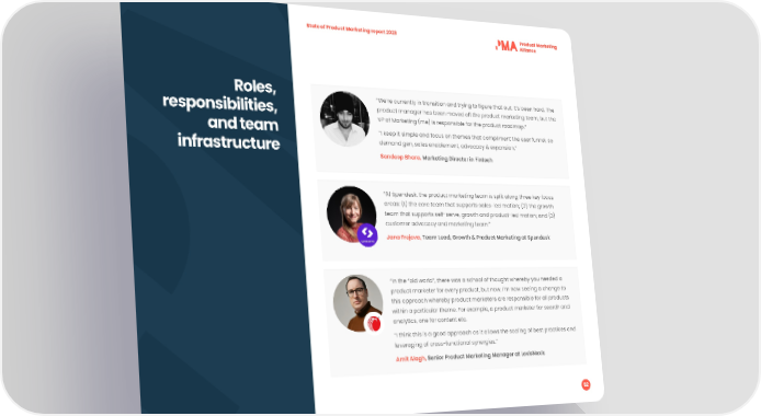 State of Product Marketing report 2023 Roles, “We’re currently in transition and trying to 昀椀gure that out. It’s been hard. The responsibilities, product manager has been moved off the product marketing team, but the VP of Marketing (me) is responsible for the product roadmap.” and team “I keep it simple and focus on themes that compliment the user funnel, so infrastructure demand gen, sales enablement, advocacy & expansion.” Sandeep Bhara, Marketing Director in Fintech “At Spendesk, the product marketing team is split along three key focus areas: (1) the core team that supports sales-led motion; (2) the growth team that supports self-serve, growth and product-led motion; and (3) customer advocacy and marketing team.” Jana Frejova, Team Lead, Growth & Product Marketing at Spendesk “In the “old world”, there was a school of thought whereby you needed a product marketer for every product, but now, I’m now seeing a change to this approach whereby product marketers are responsible for all products within a particular theme. For example, a product marketer for search and analytics, one for content etc. “I think this is a good approach as it allows the scaling of best practices and leveraging of cross-functional synergies.” Amit Alagh, Senior Product Marketing Manager at LexisNexis 52