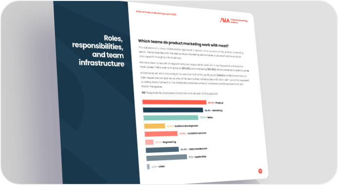 State of Product Marketing report 2023 Roles, Which teams do product marketing work with most? responsibilities, The adoption of a cross-collaborative approach is pivotal to the success of any product marketing team. The companies with the best product marketing teams foster a culture of communication and team and support throughout the business. infrastructure We were keen to see which departments our respondents work with most frequently and found in most cases, PMMs work with product (89.4%) and marketing (83.4%), which came as no great surprise. A takeaway we were encouraged by was over half of the participants (55%) identi昀椀ed leadership at their respective companies as one of the teams they collaborated with the most - could this represent a sliding doors moment in the relationship between product marketers and the powers that be? Watch this space… NB: Respondents could select more than one answer for this question. 89.4% - Product 83.4% - Marketing 75.5% - Sales 27.8% - Business development 44.4% - Customer success 10.6% - Engineering 44.4% - Sales enablement 55% - Leadership 3.3% - Other 41