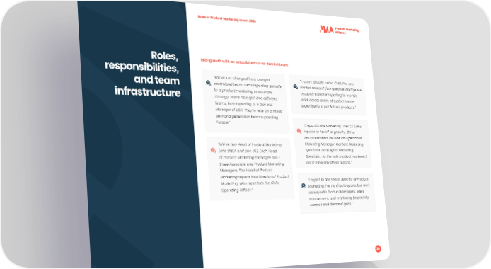 State of Product Marketing report 2023 Roles, Mid-growth with an established Go-to-Market team responsibilities, “We’ve just changed from being a “I report directly to the CMO. I’ve one and team centralized team. I was reporting globally market research/competitive intelligence to a product marketing boss under product marketer reporting to me. We infrastructure strategy. We’re now split into different work across areas of subject matter teams. I am reporting to a General expertise for a portfolio of products.” Manager of USA. They’re now on a mixed demand generation team supporting Europe.” “I report to the Marketing Director (who reports to the VP of growth). Other team members include an Operations Marketing Manager, Content Marketing “We’ve two Head of Product Marketing (one EMEA and one US). Each Head Specialist, and Digital Marketing of Product Marketing manages two - Specialist. As the sole product marketer, I three Associate and Product Marketing don’t have any direct reports.” Managers. The Head of Product Marketing reports to a Director of Product “I report to the Senior Director of Product Marketing, who reports to the Chief Marketing. I’ve no direct reports, but work Operating Of昀椀cer.” closely with Product Managers, sales enablement, and marketing (especially content and demand gen).” 38