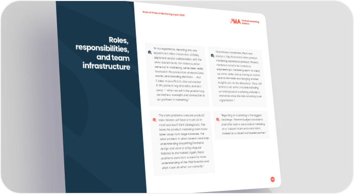 State of Product Marketing report 2023 Roles, responsibilities, “In my experience, reporting into one “At previous companies, there was department often means less visibility, always a big disconnect when product and team alignment and/or collaboration with the marketing reported to product. Product other departments. For instance, when marketers tend to be treated as infrastructure we’ve sat in marketing, we’ve been really engineering’s ‘marketing team’ to pretty involved in the production of assets/web, up some slides versus having an actual events, and branding decisions -- but seat at the table and bringing market it takes more effort to stay connected insights, etc., to the discussion. There still to the product org and sales. And vice seems to be some misunderstanding versa -- when we sat in the product org, on what product marketing actually is we had less oversight and connection to and what value the role can bring to an our partners in marketing.” organization.” “The main problems I see are product/ “Reporting to marketing is the biggest sales leaders will have a to-do list in challenge. There’re budget constraints mind and won’t think strategically. This and other teams see product marketing leads the product marketing team to be as a ‘support team and order taker’, taken away from large initiatives. The instead of a valued and trusted partner.” other problem is when leaders need help understanding storytelling/narrative design and want to bring singular features to the market. Again, these problems stem from a need for more understanding of the PMM function and what it can do when run correctly.” 44
