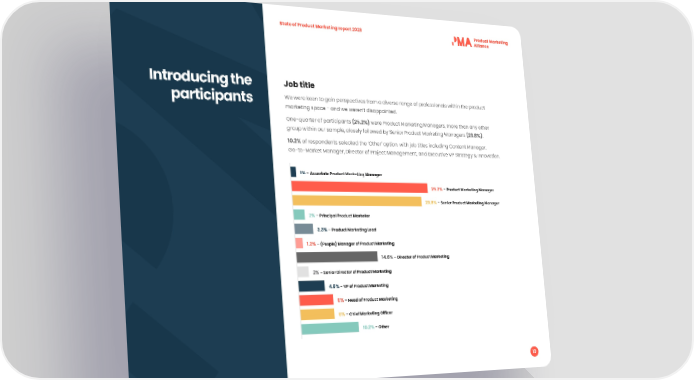 State of Product Marketing report 2023 Introducing the Job title participants We were keen to gain perspectives from a diverse range of professionals within the product marketing space - and we weren’t disappointed. One-quarter of participants (25.2%) were Product Marketing Managers, more than any other group within our sample, closely followed by Senior Product Marketing Managers (23.8%). 10.2% of respondents selected the ‘Other’ option, with job titles including Content Manager, Go-to-Market Manager, Director of Project Management, and Executive VP Strategy & Innovation. 1%1% - Associate Product Marketing Manager 25.2%25.2% - Product Marketing Manager 23.8%23.8% - Senior Product Marketing Manager 2% - Principal Product Marketer 3.3%3.3% - Product Marketing Lead 1.3%1.3% - (People) Manager of Product Marketing 14.6%14.6% - Director of Product Marketing 2% - Senior Director of Product Marketing 4.6%4.6% - VP of Product Marketing 6%6% - Head of Product Marketing 6%6% - Chief Marketing Of昀椀cer 10.2% - Other 10