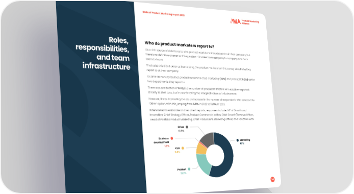 State of Product Marketing report 2023 Roles, Who do product marketers report to? responsibilities, It’s a rich source of debate as to who product marketers should report to in their company, but there’s no de昀椀nitive answer to this question - it varies from company to company, and from and team team to team. infrastructure That said, this didn’t deter us from asking the product marketers in this survey about who they report to at their company. It came as no surprise that product marketers cited marketing (57%) and product (19.2%) as the two departments they report to. There was a reduction of 0.6% in the number of product marketers who said they reported directly to their CEO, but it’s worth noting the marginal nature of this decrease. However, it was interesting to note an increase in the number of respondents who selected the ‘Other’ option, with this jumping from 5.9% in 2022 to 13.9% in 2023. When asked to elaborate on their direct reports, responses included VP of Growth and Innovation, Chief Strategy Of昀椀cer, Product Commercialization, Chief Growth/Revenue Of昀椀cer, Head of Portfolio Product Marketing, Chief Product and Marketing Of昀椀cer, and Solutions Lead. Other 13.9%13.9% Business development Marketing 1.3%1.3% CEO 57%57% 8.6%8.6% Product 19.2%19.2% 34