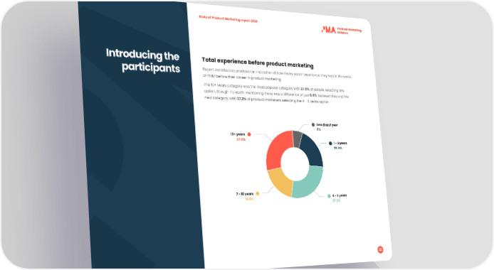 State of Product Marketing report 2023 Introducing the Total experience before product marketing participants Report contributors provided an indication of how many years’ experience they had in the world of PMM before their career in product marketing. The 10+ years category was the most popular category with 27.8% of people selecting this option, though it’s worth mentioning there was a difference of just 0.6% between this and the next category, with 27.2% of product marketers selecting the 4 - 6 years option. Less than 1 year 6%6% 10+ years 27.8%27.8% 1 - 3 years 20.5%20.5% 7 - 10 years 18.5%18.5% 4 - 6 years 27.2%27.2% 22