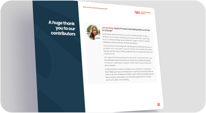 State of Product Marketing report 2023 A huge thank Jen Bunting, Head of Product Marketing EMEA & LATAM at LinkedIn you to our contributors As the leader LinkedIn’s Product and Vertical Marketing teams in EMEA & LATAM for the company’s advertising business, Jen Bunting is responsible for Go-to-Market strategy, sales enablement, regional research, localized messaging, product launches, and product adoption. The intersection of technology with advertising and marketing has played a prevalent role in Jen’s career couple of decades now. Following this passion has took her from Silicon Valley, across the Paci昀椀c to Australia and Asia, and currently the UK. Jen’s experiences have presented her with a front row seat from start-ups to enterprises where she’s worked on products that created the genesis of in昀氀uencer marketing, the explosion mobile advertising, and ubiquity of social networks. Outside the realm of product marketing, Jen’s a member of the IAB UK’s Social Steering Group and Ambassador for the Product Marketing Alliance. She’s an ally and volunteer for LinkedIn’s Asian Alliance Employee Resource Group, helping foster deeper and actionable programmes to increase diversity, inclusion, and belonging. 131