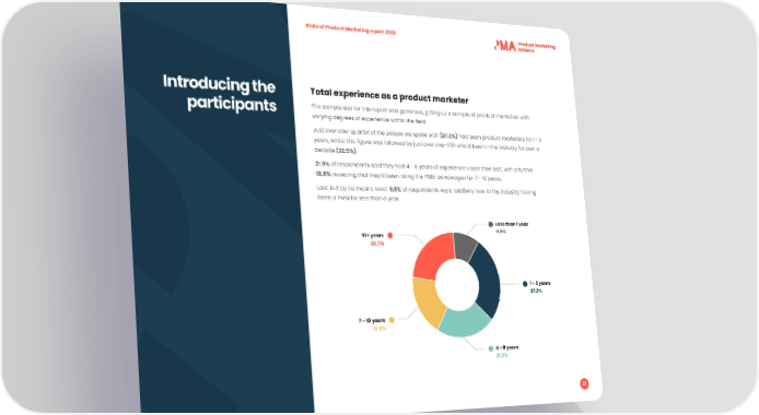 State of Product Marketing report 2023 Introducing the Total experience as a product marketer participants The sample size for this report was generous, gifting us a sample of product marketers with varying degrees of experience within the 昀椀eld. Just over one-quarter of the people we spoke with (27.2%) had been product marketers for 1 - 3 years, whilst this 昀椀gure was followed by just over one-昀椀fth who’d been in the industry for over a decade (22.5%). 21.9% of respondents said they had 4 - 6 years of experience under their belt, with a further 18.5% revealing that they’d been riding the PMM bandwagon for 7 - 10 years. Last, but by no means least, 9.9% of respondents were relatively new to the industry, having been a PMM for less than a year. Less than 1 year 9.9%9.9% 10+ years 22.5%22.5% 1 - 3 years 27.2%27.2% 7 - 10 years 18.5%18.5% 4 - 6 years 21.9%21.9% 21