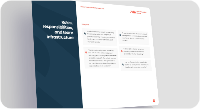 State of Product Marketing report 2023 Roles, Enterprise responsibilities, “Product marketing reports to marketing. “I report to a business development lead and team There’re other roles that are part of who reports to our product and business product marketing, including competitive developers director. I have no direct infrastructure intelligence, customer advocacy, and reports.” 昀椀rst-party events.” “I report to the Director of Product “There’s no formal product marketing Marketing and work with a Senior role, but we have sales enablement Specialist of Product Marketing.” which supports industry teams with sales and pitch materials. The solutions group works to develop our own ‘products’ so our client leads can listen for problems “The services marketing organization and introduce us as a solution.” reports up to the product business unit. We align with corporate marketing.” 40