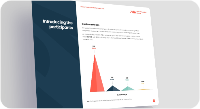 State of Product Marketing report 2023 Introducing the Customer types participants We wanted to understand what types of customers product marketers are serving at their companies. Because let’s face it, without the customer, product marketing efforts are futile. An overwhelming majority of the people we spoke with said they market to a B2B customer base (93.4%), with 13.9% indicating they cater to a B2C audience. In 10.6% of cases, respondents worked in B2D. B2B 93.4% B2C B2D 13.9% 10.6% Other 1.3% Customer type NB: Participants could select more than one option for this question. 12