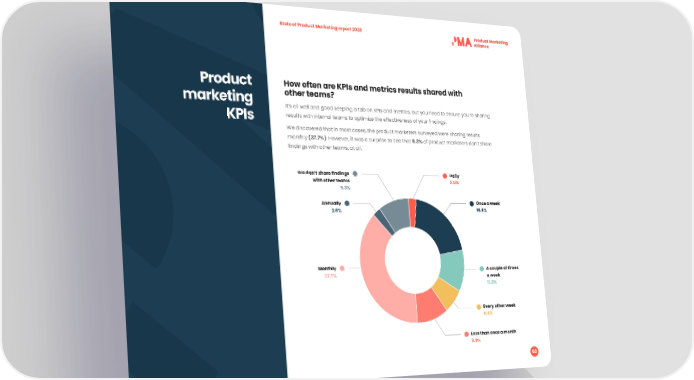 State of Product Marketing report 2023 Product How often are KPIs and metrics results shared with marketing other teams? It’s all well and good keeping a tab on KPIs and metrics, but you need to ensure you’re sharing KPIs results with internal teams to optimize the effectiveness of your 昀椀ndings. We discovered that in most cases, the product marketers surveyed were sharing results monthly (37.7%). However, it was a surprise to see that 9.3% of product marketers don’t share 昀椀ndings with other teams, at all. Daily We don’t share 昀椀ndings with other teams 2.6%2.6% 9.3%9.3% Once a week Annually 2.6%2.6% 19.9%19.9% Monthly A couple of times 37.7%37.7% a week 11.3%11.3% Every other week 6.6%6.6% Less than once a month 9.9%9.9% 63