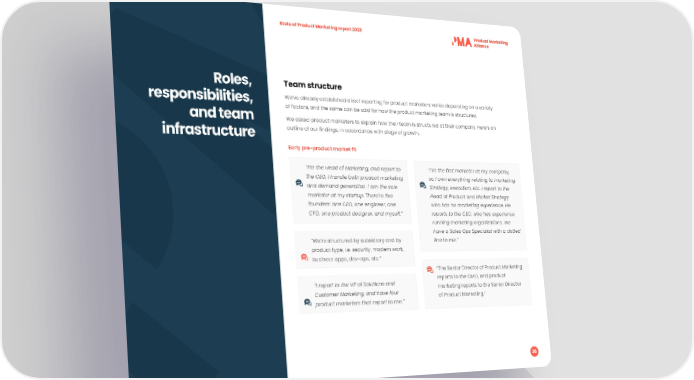State of Product Marketing report 2023 Roles, Team structure responsibilities, We’ve already established direct reporting for product marketers varies depending on a variety of factors, and the same can be said for how the product marketing team is structured. and team We asked product marketers to explain how their team is structured at their company. Here’s an infrastructure outline of our 昀椀ndings, in accordance with stage of growth. Early pre-product market 昀椀t “I’m the Head of Marketing, and report to “I’m the 昀椀rst marketer at my company, the CEO. I handle both product marketing so I own everything relating to marketing. and demand generation. I am the sole Strategy, execution, etc. I report to the marketer at my startup. There’re 昀椀ve Head of Product and Market Strategy founders: one CEO, one engineer, one who has no marketing experience. He CFO, one product designer, and myself.” reports to the CEO, who has experience running marketing organizations. We have a Sales Ops Specialist with a dotted “We’re structured by subsidiary and by line to me.” product type, i.e. security, modern work, business apps, dev-ops, etc.” “The Senior Director of Product Marketing “I report to the VP of Solutions and reports to the CMO, and product marketing reports to the Senior Director Customer Marketing, and have four product marketers that report to me.” of Product Marketing.” 36