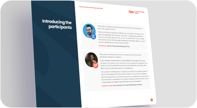 State of Product Marketing report 2023 Introducing the “The notion of ‘culture’ is a top-down thing, and Zi昀氀ow’s co-founders are participants extremely cognizant of that. “When creating our employee handbook and core values, they took care to bold-face ideas like “The customer is the hero”, “Progress over perfection”, “Focus on the right things” and “Be curious, humble, and fair”. So, as a PMM, it’s amazing to know that the type of values that I 昀椀nd best suited to my own success are literally part of the company’s DNA.” Erik Mansur, Head of Product Marketing at Zi昀氀ow “The culture at Airbase stems from our company values which puts everyone in control of our destiny. “Every member and every team is empowered to make their mark on the company and help be a core contributor to our success. This empowerment allows us to think outside the box and take educated bets, move fast, learn faster and grow both personally and professionally. “As a product marketing team, this gives us ownership to prioritize what we know is most important to the business, ideate on how to tackle problems with new approaches and own the success of our business. This couldn’t be more important, especially for the product marketing function which covers a wide breadth and depth responsibilities across the business.” Sonduren Fanarredha, Director of Product Marketing at Airbase 19
