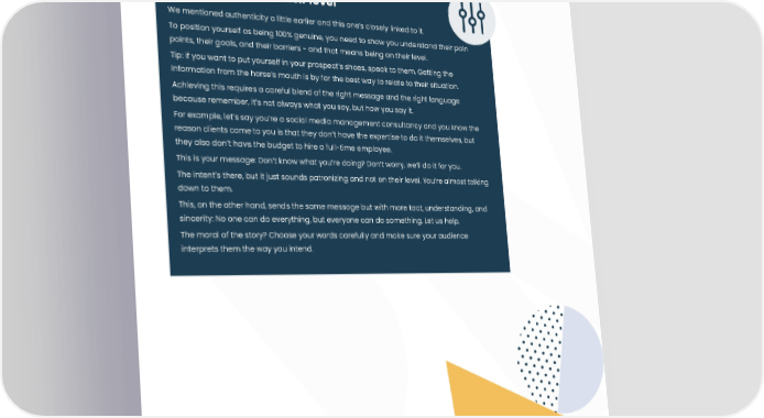 014 An intro to narrative design 10. Put yourself on their level We mentioned authenticity a little earlier and this one’s closely linked to it. To position yourself as being 100% genuine, you need to show you understand their pain points, their goals, and their barriers - and that means being on their level. Tip: if you want to put yourself in your prospect’s shoes, speak to them. Getting the information from the horse’s mouth is by far the best way to relate to their situation. Achieving this requires a careful blend of the right message and the right language because remember, it’s not always what you say, but how you say it. For example, let’s say you’re a social media management consultancy and you know the reason clients come to you is that they don’t have the expertise to do it themselves, but they also don’t have the budget to hire a full-time employee. This is your message: Don’t know what you’re doing? Don’t worry, we’ll do it for you. The intent’s there, but it just sounds patronizing and not on their level. You’re almost talking down to them. This, on the other hand, sends the same message but with more tact, understanding, and sincerity: No one can do everything, but everyone can do something. Let us help. The moral of the story? Choose your words carefully and make sure your audience interprets them the way you intend.