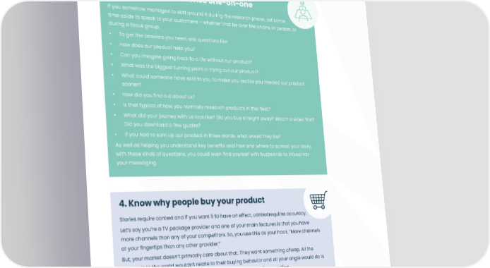 011 An intro to narrative design 3. Speak to your audience one-on-one If you somehow managed to skirt around it during the research phase, set some time aside to speak to your customers – whether that be over the phone, in person, or during a focus group. • To get the answers you need, ask questions like: • How does our product help you? • Can you imagine going back to a life without our product? • What was the biggest turning point in trying out our product? • What could someone have said to you to make you realize you needed our product sooner? • How did you 昀椀nd out about us? • Is that typical of how you normally research products in this 昀椀eld? • What did your journey with us look like? Did you buy straight away? Watch a video 昀椀rst? Did you download a few guides? • If you had to sum up our product in three words, what would they be? As well as helping you understand key bene昀椀ts and how and where to spread your story, with these kinds of questions, you could even 昀椀nd yourself with buzzwords to infuse into your messaging. 4. Know why people buy your product Stories require context and if you want it to have an effect, contextrequires accuracy. Let’s say you’re a TV package provider and one of your main features is that you have more channels than any of your competitors. So, you use this as your hook. “More channels at your 昀椀ngertips than any other provider.” But, your market doesn’t primarily care about that. They want something cheap. All the channels in the world wouldn’t relate to their buying behavior and all your angle would do is alienate them from the outset - which is the exact opposite of connecting. Instead, with the right info under your belt, you might go in with something like “Like John, you too could save £110 a year on your TV package - without compromising on your channels.” Relying on assumption is a route to failure - don’t lose sight of the importance of research.