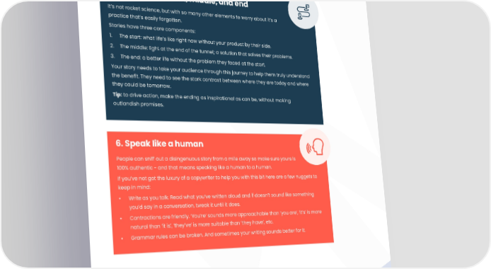 012 An intro to narrative design 5. Have a clear start, middle, and end It’s not rocket science, but with so many other elements to worry about it’s a practice that’s easily forgotten. Stories have three core components: 1. The start: what life’s like right now without your product by their side. 2. The middle: light at the end of the tunnel; a solution that solves their problems. 3. The end: a better life without the problem they faced at the start. Your story needs to take your audience through this journey to help them truly understand the bene昀椀t. They need to see the stark contrast between where they are today and where they could be tomorrow. Tip: to drive action, make the ending as inspirational as can be, without making outlandish promises. 6. Speak like a human People can sniff out a disingenuous story from a mile away so make sure yours is 100% authentic - and that means speaking like a human to a human. If you’ve not got the luxury of a copywriter to help you with this bit here are a few nuggets to keep in mind: • Write as you talk. Read what you’ve written aloud and if doesn’t sound like something you’d say in a conversation, tweak it until it does. • Contractions are friendly. ‘You’re’ sounds more approachable than ‘you are’, ‘it’s’ is more natural than ‘it is’, ‘they’ve’ is more suitable than ‘they have’, etc. • Grammar rules can be broken. And sometimes your writing sounds better for it.