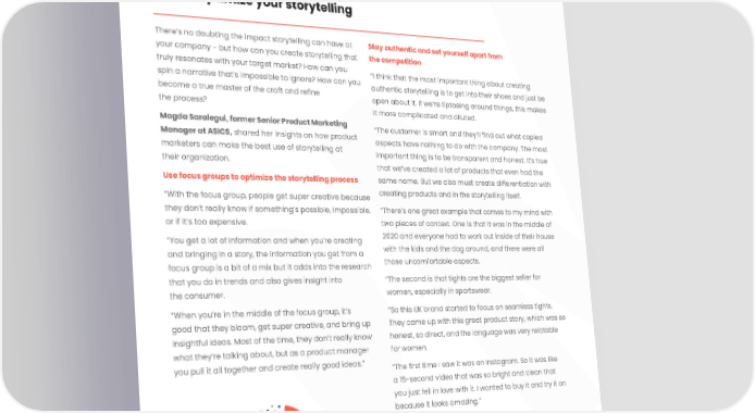04 An intro to narrative design Chapter two How to optimize your storytelling There’s no doubting the impact storytelling can have at Stay authentic and set yourself apart from your company - but how can you create storytelling that the competition truly resonates with your target market? How can you “I think that the most important thing about creating spin a narrative that’s impossible to ignore? How can you authentic storytelling is to get into their shoes and just be become a true master of the craft and re昀椀ne open about it. If we’re tiptoeing around things, this makes the process? it more complicated and diluted. Magda Saralegui, former Senior Product Marketing Manager at ASICS, shared her insights on how product “The customer is smart and they’ll 昀椀nd out what copied marketers can make the best use of storytelling at aspects have nothing to do with the company. The most their organization. important thing is to be transparent and honest. It’s true that we’ve created a lot of products that even had the Use focus groups to optimize the storytelling process same name. But we also must create differentiation with “With the focus group, people get super creative because creating products and in the storytelling itself. they don’t really know if something’s possible, impossible, “There’s one great example that comes to my mind with or if it’s too expensive. two pieces of context. One is that it was in the middle of “You get a lot of information and when you’re creating 2020 and everyone had to work out inside of their house and bringing in a story, the information you get from a with the kids and the dog around, and there were all focus group is a bit of a mix but it adds into the research those uncomfortable aspects. that you do in trends and also gives insight into “The second is that tights are the biggest seller for the consumer. women, especially in sportswear. “When you’re in the middle of the focus group, it’s “So this UK brand started to focus on seamless tights. good that they bloom, get super creative, and bring up They came up with this great product story, which was so insightful ideas. Most of the time, they don’t really know honest, so direct, and the language was very relatable what they’re talking about, but as a product manager for women. you pull it all together and create really good ideas.” “The 昀椀rst time I saw it was on Instagram. So it was like a 15-second video that was so bright and clean that you just fell in love with it. I wanted to buy it and try it on because it looks amazing.”