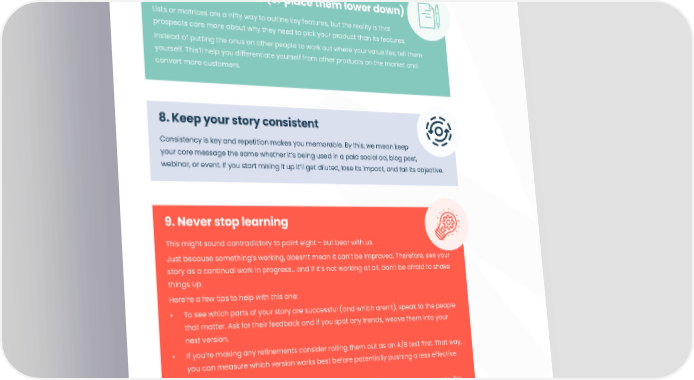 013 An intro to narrative design 7. Scrap feature lists (or place them lower down) Lists or matrices are a nifty way to outline key features, but the reality is that prospects care more about why they need to pick your product than its features. Instead of putting the onus on other people to work out where your value lies, tell them yourself. This’ll help you differentiate yourself from other products on the market and convert more customers. 8. Keep your story consistent Consistency is key and repetition makes you memorable. By this, we mean keep your core message the same whether it’s being used in a paid social ad, blog post, webinar, or event. If you start mixing it up it’ll get diluted, lose its impact, and fail its objective. 9. Never stop learning This might sound contradictory to point eight - but bear with us. Just because something’s working, doesn’t mean it can’t be improved. Therefore, see your story as a continual work in progress… and if it’s not working at all, don’t be afraid to shake things up. Here’re a few tips to help with this one: • To see which parts of your story are successful (and which aren’t), speak to the people that matter. Ask for their feedback and if you spot any trends, weave them into your next version. • If you’re making any re昀椀nements consider rolling them out as an A/B test 昀椀rst. That way, you can measure which version works best before potentially pushing a less effective story out. • When you’re tweaking and testing, remember to experiment with different aspects, like the words and images you use, the channels you share them on, and the type of asset (i.e. video, audio, blog, etc.). • Always keep in mind that although your product might not have changed, people’s preferences, behaviors, and attitudes might’ve, and this could have a knock-on effect.