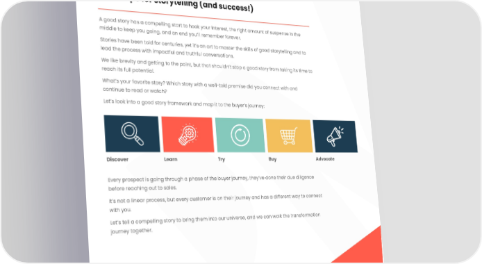 07 An intro to narrative design Chapter four The recipe for storytelling (and success!) A good story has a compelling start to hook your interest, the right amount of suspense in the middle to keep you going, and an end you’ll remember forever. Stories have been told for centuries, yet it’s an art to master the skills of good storytelling and to lead the process with impactful and truthful conversations. We like brevity and getting to the point, but that shouldn’t stop a good story from taking its time to reach its full potential. What’s your favorite story? Which story with a well-told premise did you connect with and continue to read or watch? Let’s look into a good story framework and map it to the buyer’s journey: Discover Learn Try Buy Advocate Every prospect is going through a phase of the buyer journey, they’ve done their due diligence before reaching out to sales. It’s not a linear process, but every customer is on their journey and has a different way to connect with you. Let’s tell a compelling story to bring them into our universe, and we can walk the transformation journey together.
