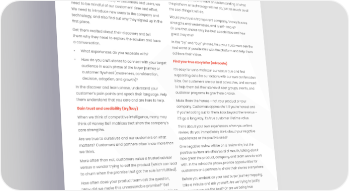 08 An intro to narrative design Make it worth the time to care (discover/learn) It’s always important to have an understanding of what When we narrate our story to customers and users, we the platform or technology will not do, just as much as all need to be mindful of our customers’ time and effort. the cool things it will do. We need to introduce new users to the company and Would you trust a transparent company, knows its core technology, and also 昀椀nd out why they signed up in the strengths and weaknesses, and is self-aware? 昀椀rst place. Or one that shows only the best capabilities and how Get them excited about their discovery and tell great they are? them why they need to explore the solution and have In the “try” and “buy” phases, help your customers see the a conversation. real world of possibilities with the platform and help them • What experiences do you resonate with? achieve their vision. • How do you craft stories to connect with your target Find your true storyteller (advocate) audience in each phase of the buyer journey or It’s easy for us to maintain our status quo and 昀椀nd customer 昀氀ywheel (awareness, consideration, supporting data for our actions with our own con昀椀rmation decision, adoption, and growth)? bias. Our customers are our best advocates, and we need In the discover and learn phase, understand your to help them tell their stories at user groups, events, and customer’s pain points and speak their language. Help customer programs to give them a voice. them understand that you care and are here to help. Make them the heroes – not your product or your Gain trust and credibility (try/buy) company. Customers appreciate it if you’re honest and if you’re looking out for them. Look beyond the revenue – When we think of competitive intelligence, many may it’ll go a long way, it’s true customer lifetime value. think of Harvey Ball matrices that show the company’s Think about your own experiences: when you write a core strengths. review, do you immediately think about your negative Are we true to ourselves and our customers on what experiences or the positive ones? matters? Customers and partners often know more than One negative review will be on a review site, but the we think. positive reviews are often word of mouth, talking about More often than not, customers value a trusted advisor how great the product, company, and team were to work versus a vendor trying to sell the product (which can lead with. In the advocate phase, provide opportunities for to churn when the promise that got the sale isn’t ful昀椀lled). customers and partners to share their stories everywhere. How often does your product team ask the question, Before you embark on your next buyer journey mapping, “Why did we make this unreasonable promise?” Sell take a minute and ask yourself: Are we trying to justify what’s available today, and be transparent on what is on and prove we are the best? Or are we being true the roadmap and what doesn’t or will not exist. to ourselves?