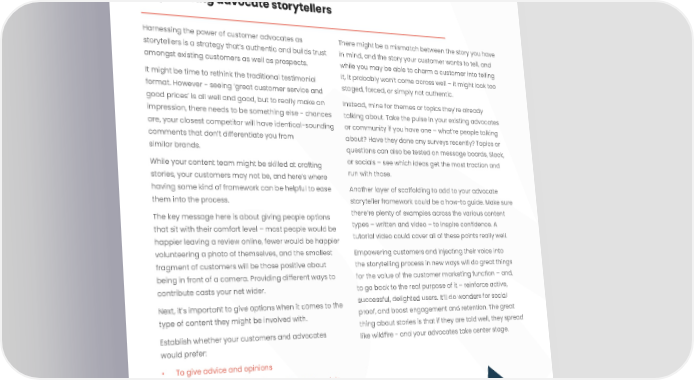 06 An intro to narrative design Chapter three Empowering advocate storytellers Harnessing the power of customer advocates as There might be a mismatch between the story you have storytellers is a strategy that’s authentic and builds trust in mind, and the story your customer wants to tell, and amongst existing customers as well as prospects. while you may be able to charm a customer into telling It might be time to rethink the traditional testimonial it, it probably won’t come across well – it might look too format. However - seeing ‘great customer service and staged, forced, or simply not authentic. good prices’ is all well and good, but to really make an Instead, mine for themes or topics they’re already impression, there needs to be something else - chances talking about. Take the pulse in your existing advocates are, your closest competitor will have identical-sounding or community if you have one – what’re people talking comments that don’t differentiate you from about? Have they done any surveys recently? Topics or similar brands. questions can also be tested on message boards, Slack, While your content team might be skilled at crafting or socials – see which ideas get the most traction and stories, your customers may not be, and here’s where run with those. having some kind of framework can be helpful to ease Another layer of scaffolding to add to your advocate them into the process. storyteller framework could be a how-to guide. Make sure The key message here is about giving people options there’re plenty of examples across the various content that sit with their comfort level – most people would be types – written and video – to inspire con昀椀dence. A happier leaving a review online, fewer would be happier tutorial video could cover all of these points really well. volunteering a photo of themselves, and the smallest Empowering customers and injecting their voice into fragment of customers will be those positive about the storytelling process in new ways will do great things being in front of a camera. Providing different ways to for the value of the customer marketing function – and, contribute casts your net wider. to go back to the real purpose of it – reinforce active, Next, it’s important to give options when it comes to the successful, delighted users. It’ll do wonders for social type of content they might be involved with. proof, and boost engagement and retention. The great thing about stories is that if they are told well, they spread Establish whether your customers and advocates like wild昀椀re - and your advocates take center stage. would prefer: • To give advice and opinions • Written testimonials / reviews, video testimonials • A video on a subject of their expertise/choice • An industry expert piece, or contribution to a report