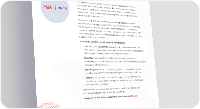 25 Navigating today’s product marketing landscape Hire a product marketer In a market where thousands of jobs are posted each week and only a handful of PMMs are available, hiring can be a challenge. It can take an Recruit average of 42 days to fill a position. But what if you could streamline this process and find candidates who are just right for your company? That’s where PMA Recruit comes in. PMA Recruit is a 360° recruitment partner offering bespoke candidate sourcing. When you sign up, your company’s needs become our top priority. We go the extra mile to understand the essential skills your candidates require, your hiring process, company culture, and the job order. Armed with this knowledge, we tap into our extensive network to find candidates who are a perfect fit for your company. But why choose PMA Recruit? Here are a few reasons: • Trust: Our candidates trust us. We only put a candidate forward if we know your company meets their requirements and they’re committed to helping you achieve your short and long-term targets. • Expertise: Our content team is fluent in the language of product marketing. We provide indispensable advice on how to write engaging job descriptions that stand out. • Upskilling: We offer hundreds of long and short courses that can be included as part of the package, helping you upskill any candidate. • Network: PMA is home to the world’s largest network of PMMs, with practitioners from globally-recognized brands such as Amazon Web Services, TikTok, and Uber. With PMA Recruit, you can say “goodbye” to mediocre hires and start recruiting candidates who tick all the right boxes. To learn more and discuss your needs, contact Jordan Dunne.
