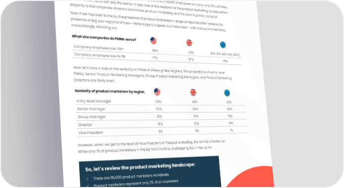 7 Navigating today’s product marketing landscape Imbalance in company sizes and PMM seniority But wait, there’s more! While nearly 40% of PMMs in the USA work for companies with 10,000 employees or more, only 25% of PMMs in the UK and the EU can say the same. In fact, one of the reasons for the product marketing vs. population disparity is that corporate America dominates product marketing and the work is global, not local. Now, if we hop over to the EU, the presence of product marketers in large companies often reflects the presence of big sub-regional offices – think major European business hubs – with France and Germany, unsurprisingly, standing out. What size companies do PMMs serve? Company employee size 10k+ 39% 25% 25% (FR 44% GER 40%) Company employee size 1k-5k 17% 17% 15% Now let’s take a look at the seniority of PMMs in these global regions. The proportions of entry-level PMMs, Senior Product Marketing Managers, Group Product Marketing Managers, and Product Marketing Directors are fairly even. Seniority of product marketers by region Entry level manager 29% 34% 36% Senior manager 22% 25% 29% Group manager 21% 17% 15% Director 19% 17% 14% Vice President 6% 3% 1% However, when we get to the level of Vice President of Product Marketing, the US hits a home run. While only 1% of product marketers in the EU hold this title, a whopping 6% in the US do. So, let’s review the product marketing landscape: 3 There are 116,000 product marketers worldwide 3 Product marketers represent only 2% of all marketers 3 70% are in North America, the UK, and Europe 3 57% are not in North America 3 Only 50% cite English as their first language In summary, global corporate 3 40% of PMMs in the US work for companies with 10,000 or more employees multinationals dominate the 3 Seniority cascades down regionally landscape. This has a range of significant implications for the talent, skills, and availability of product marketers everywhere. + USA data.