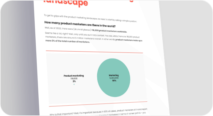 5 Navigating today’s product marketing landscape The product marketing landscape To get to grips with the product marketing landscape, we need to start by asking a simple question: How many product marketers are there in the world? Well, as of 2022, there were (drumroll please!) 116,000 product marketers worldwide. Seems like a lot, right? Well, only until you put it into context. You see, while there are 116,000 product marketers, there are around 6 million marketers overall. In other words, product marketers make up a mere 2% of the total number of marketers. Product marketing Marketing 116,000 6,000,000 2% 98% Why is that important? Well, it’s important because in 65% of cases, product marketers sit in and report to the marketing team, and the primary source of product marketers in terms of career path is – you guessed it – marketing. Perhaps this isn’t surprising. The fragmentation of the marketing department over the years has created dozens of marketing specialisms – digital marketing, performance marketing, growth marketing, brand marketing, customer marketing, and revenue marketing, to name but a few. In short, product marketing is a hot niche! But one that deserves to be bigger and better understood.